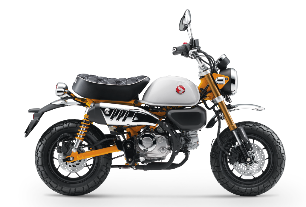- Klassisk Monkey-design från 70-talet med aphängarstyre i miniatyr, ballongdäck, kromade skärmar och uppdraget avgassystem.