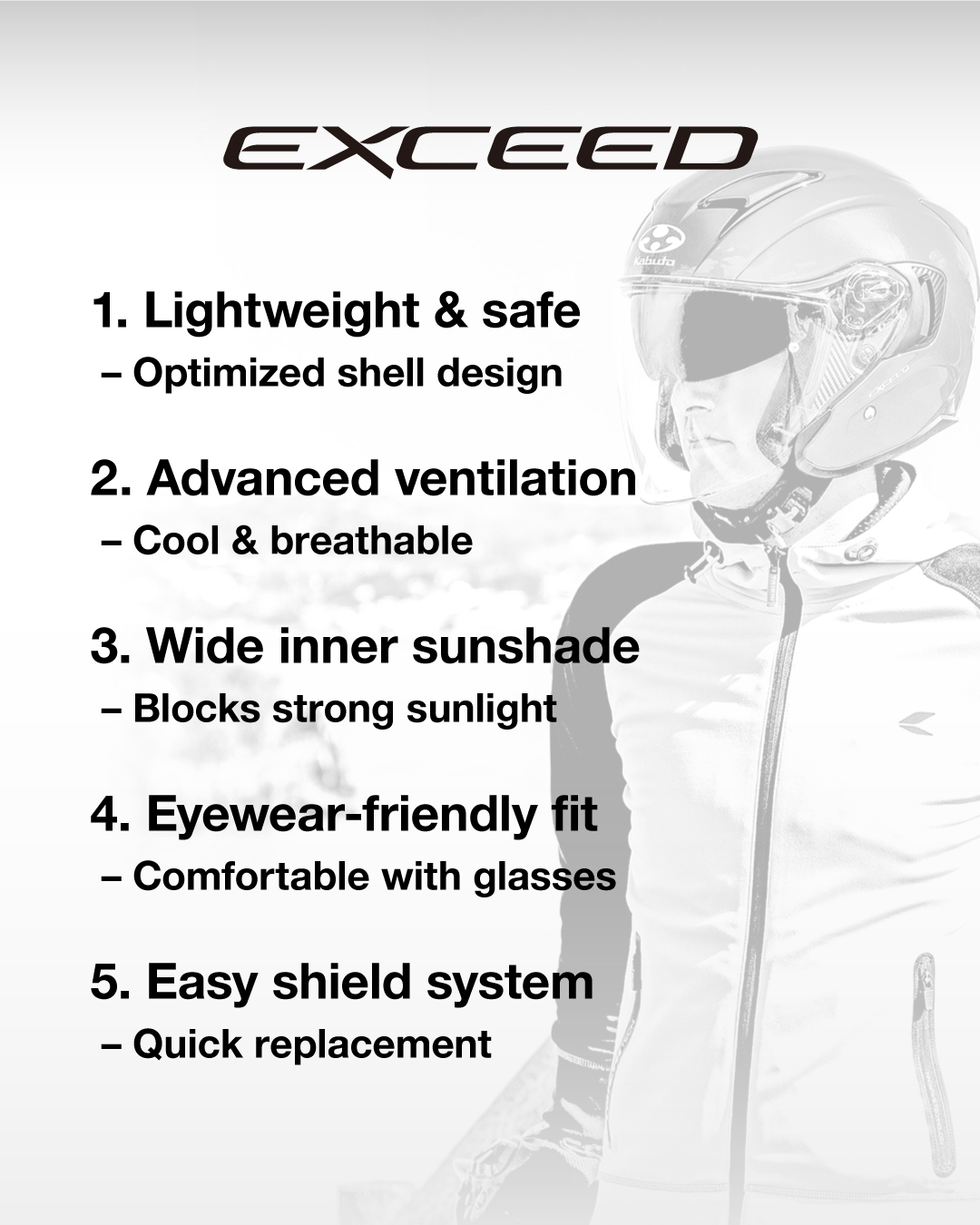 Exceed är ett starkt val för dig som värdesätter komfort, låg vikt och enkel hantering — perfekt för vardagspendling, stadskörning eller lugn cruising. Den passar särskilt bra om du vill ha en hjälm som är lätt att ta av och på, bekväm att bära länge, och ändå har bra komfort, utan att behöva full-face-hjälmens tyngd och omfattande konstruktion.